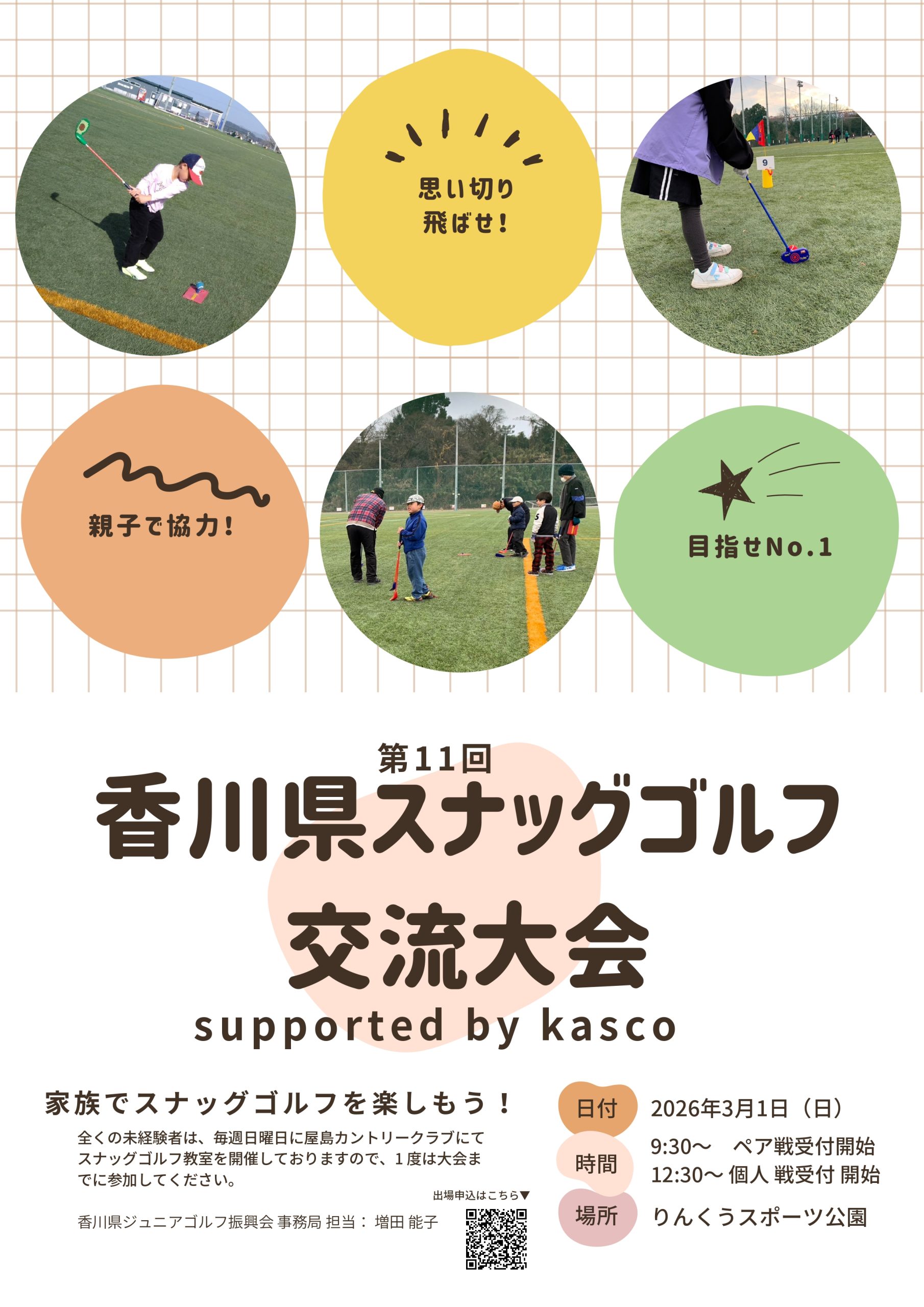 開催日:2026年3月1日(日) 9:30~ ペア戦受付開始 12:30~ 個人 戦受付 開始 会場:りんくうスポーツ公園(香川県高松市香南町岡87-1) 参加費:小学生無料,中学生以上1000円 参加資格:選手個人でプレイができること ★全くの未経験者は、毎週日曜日15時~屋島カントリークラブで増田 能子プロが行っているスナッグゴルフ教室に大会までに一度ご参加ください。 競技方法:9ホール ストロークプレイ 競技資格:個人戦/小学1年~6年生、ペア戦/小学1年~6年生の児童と大人(中学生含む) 表彰:優勝・2位・3位(表彰状とメダル) 服装:動きやすい服装・運動靴・帽子着用(道具は貸出があります)