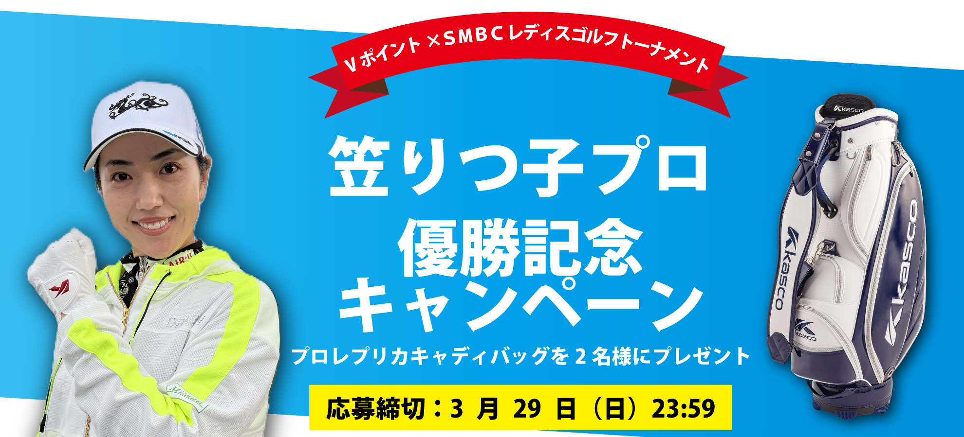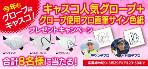 キャスコ用品契約の笠りつ子プロがVポイント×SMBC レディスゴルフトーナメント(2026年3月20日-3月22日開催)で優勝いたしました。笠プロは、【プロ支給品】日本製人工スエード タフフィット+ 笠プロ オリジナルサイズ対応品、晴雨兼用軽量傘プロレプリカキャディバッグを使用しています。 笠プロの優勝を記念して、プロレプリカキャディバッグを抽選で2名様にプレゼントいたします。