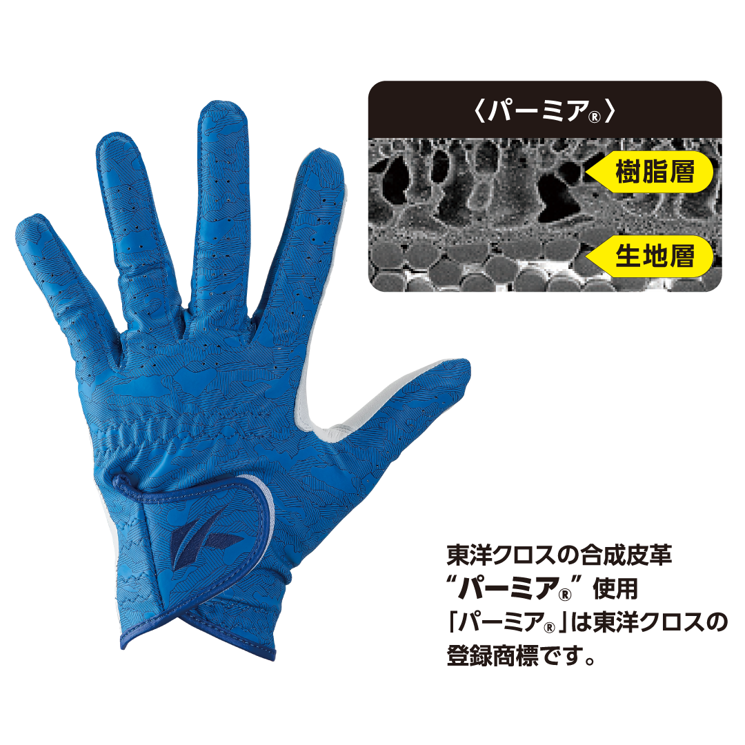 甲側は通気性と透湿性に優れた東洋クロスの合成皮革“パーミア®”を採用。手の甲側のムレを防ぎ、快適な使用感を実現します。軽やかでさらっとした素材感が、プレー中のストレスを軽減します。