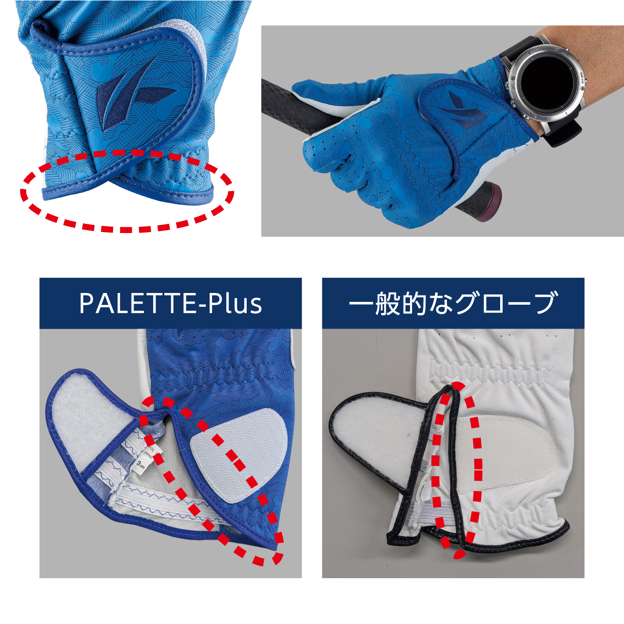 手首の動きを邪魔しないだけでなく、腕時計型距離計測器をつけてもグローブが邪魔をしないデザイン。