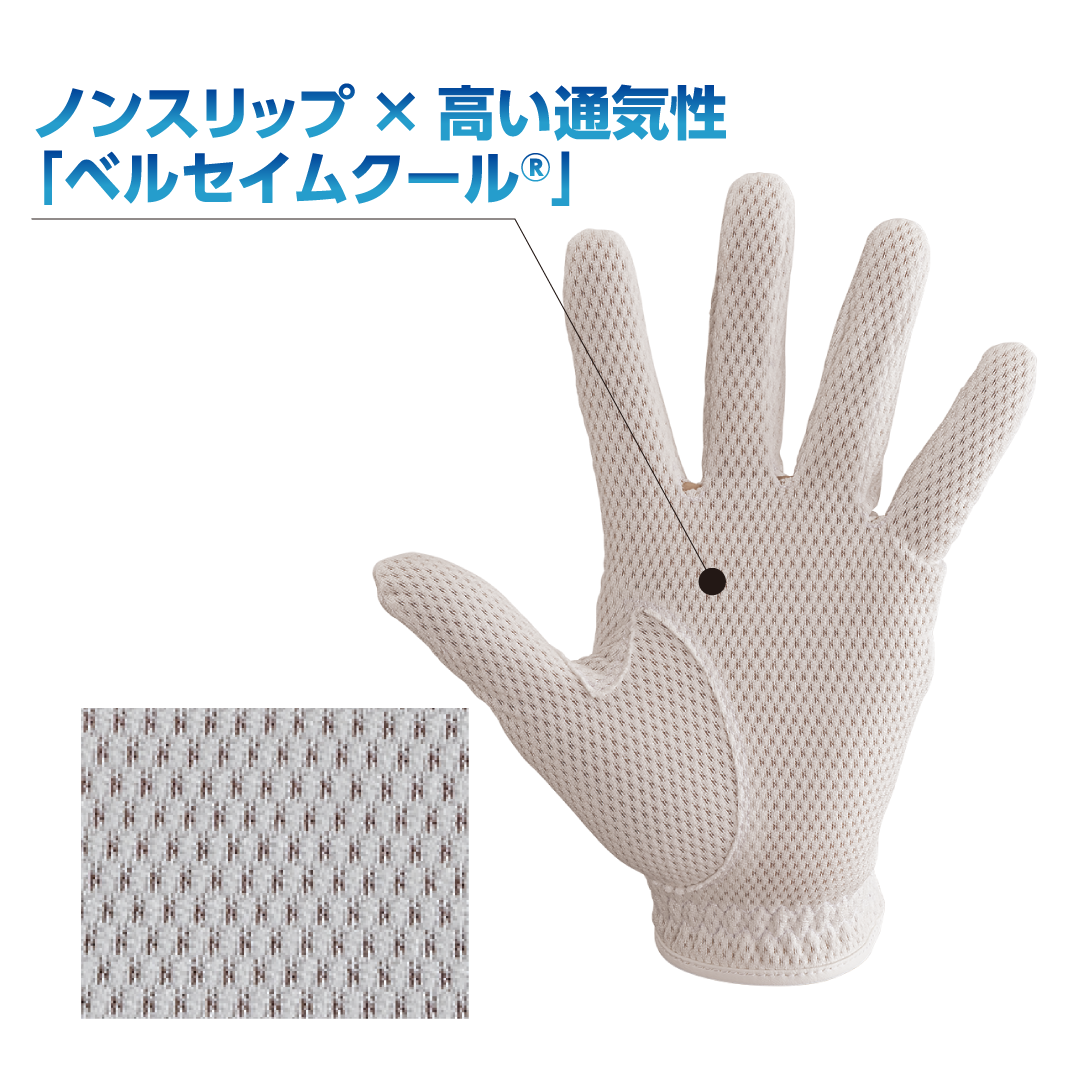 キャスコ独自の素材ベルセイム(編み目構造)だから可能になった全体メッシュ構造。通気性に優れ、さらにメッシュ構造の凹凸により、グリップ力もアップ!また、丸洗い可能なので、汗や汚れが気になったら洗えます。