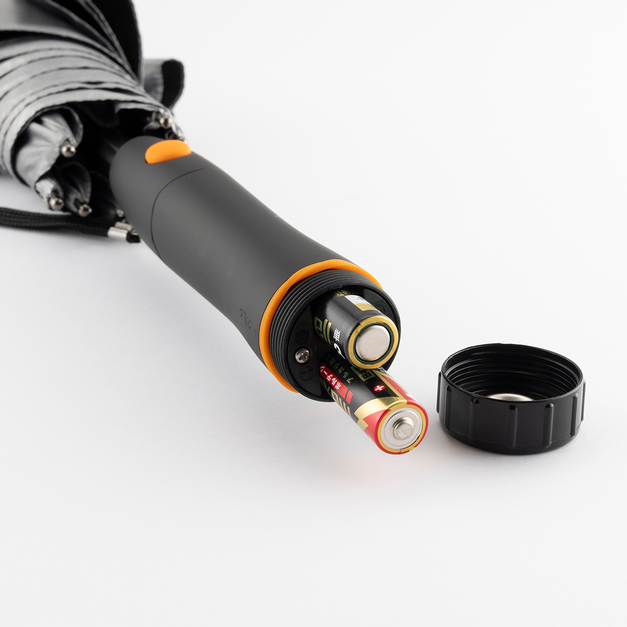 生地の表面にアルミパウダーコーティングを施し、99.7%の高いUV遮蔽効果を実現、そしてファンの効果で上昇温度を抑えて快適。| 用途 | 晴雨兼用、遮熱、UVカット、ワンタッチ、傘袋付き |